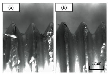 The surface externals appearance of the sample that actually processes the room temperature form rolling to Fig.1 is shown. Fig.1 (a) is the sample without giving the torsion working and anneal for 3.6ks at 673K. It was seen a great many rolling defects such as peeling and cracking of the thread. On the other hand, Fig.1 (b) is the sample treated annealing process for 3.6ks at 673K after torsion working of 1080 degrees, had cracking and peeling of the tip of the screw thread is less than Fig.1 (a). Thus, it was shown that thread rolling workability at the room temperature is improved by the torsion working. However, the forming of the thread has not been solved yet complete.