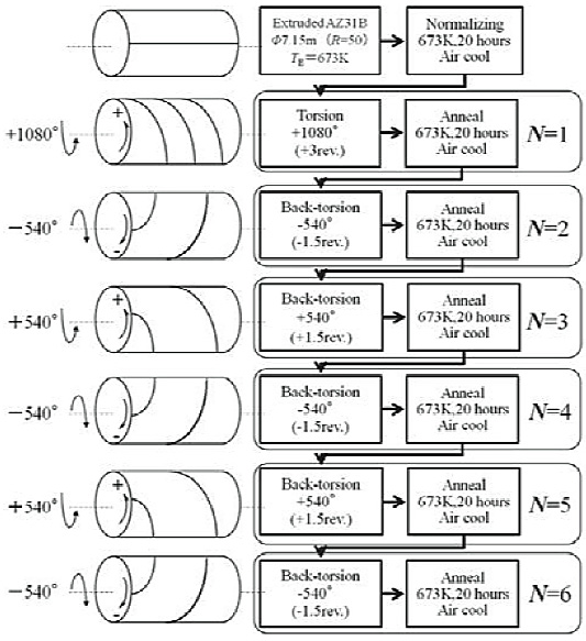 The experimental flow chart of the back-torsion working is shown in Fig.2. First of all, the extruded AZ31B was done normalizing for 72ks at 673K. Afterward, the torsion working of 1080 degrees was added in the direction of the plus, and annealing was treated for 3.6ks at 673K. In addition, the torsion working of the reverse-rotation is done to the previous process, and annealing. This process was repeated two or more times, and it was defined as back-torsion working. The torsion working angle since the second times was set into 540 degrees. In the final process, the torsion working was done until breaking. And, the number of torsion working was assumed to be N.