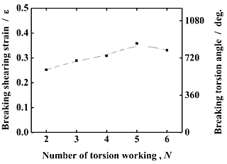 It processed until breaking when the number of torsion working was N. Then, the relation between the breaking shear strain and the torsion angle is shown in Fig.3. The breaking shear strain increased as N increases. For this reason, the improvement of the workability is suggested by giving the back-torsion working and annealing.