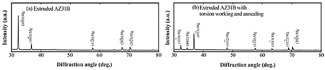 The X-ray diffraction result of extrusion material and torsion working material of AZ31B is shown in Fig.5. In any case, a vertical section was identified in the direction of the extrusion. The diffraction intensity in (1010) face has risen remarkably in the extrusion material. However, the diffraction intensity in (1010) face decreases by giving the torsion working and the annealing, and the diffraction intensity such as (1010), (0002), (1012) and (1013) faces increases. It is suggested that the crystal orientation anisotropy of the extruded material is eased by giving torsion working.