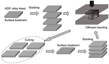 Commercial cast AZ91 magnesium alloy ingot was used as a starting material. Schematic illustration of the ADB process is shown in Fig. 1. Four sheets were surface treated by a stainless steel wire brush. The stacked sheets were uniaxially hot pressed to 2 mm height under constant load of 15 ton for 1 h. The temperature of these sheets and the pressing jigs was maintained at 673 K. A diffusion bonded sheet was cut to 4 square plates and they were hot pressed again after the same surface treatment.