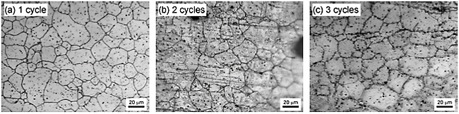 Optical microstructures of AZ91 alloy after 1, 2 and 3 ADB cycles are shown in Fig. 2. The sheets were consists of equiaxial crystal grains. Average grain sizes of 1, 2 and 3 ADB cycles were about 20