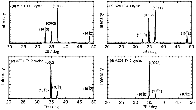 m. The specimen after 0 ADB cycle, as received, has almost random orientation. Diffraction intensity from {0002} basal plane of HCP structure increased with increasing the ADB cycle number [Fig. 3].