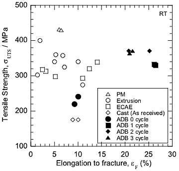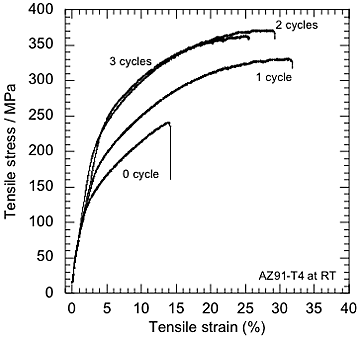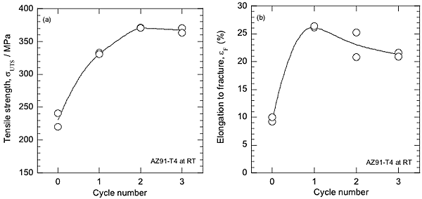 Tensile stress-strain curves of AZ91 alloy specimens after 0, 1, 2 and 3 ADB cycles were shown in Fig. 4. ADB process was effective to increase both tensile strength and elongation. In Fig. 5, the tensile strength and the elongation to fracture were plotted as a function of ADB cycle number. Tensile strength increased with increasing the ADB cycle number. The AZ91 magnesium alloy after 1 ADB cycle has 25% elongation to fracture which is extremely high compared to conventional AZ91 alloy.
