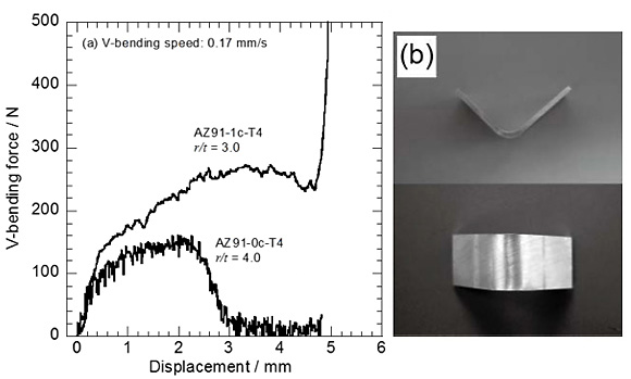 The result of 90° V-bending test at room temperature is shown in Fig. 7. This result indicates that the AZ91 magnesium alloy sheet produced through the ADB processing has a potential of multiaxial plastic deformation. Enhanced plastic deformation in this study is not caused by grain boundary sliding but by random texture development.