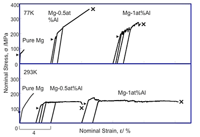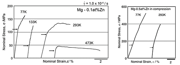 Figure 5 shows the typical stress-strain curves of Mg-Al at 77K and 293K. At 77K, yield stress was increased by aluminum addition, while strain- hardening rate of Mg-0.5at%Al was similar to that of pure magnesium. At 293K, stress-strain curve of Mg-Al alloys was drastically changed. There is no strain hardening on these curves after yielding and small serration of flow stress was also observed.