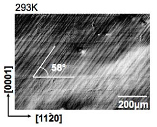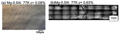 Figure 3 shows etch pit bands of Mg-0.1at%Zn at 293K. These pit bands indicated that the Mg-0.1at%Zn was yielded by {1122} < 1123 > second order pyramidal slip system. Mg-0.1at%Zn and Mg-0.5at%Zn were deformed by the non-basal slip system in all temperature range.