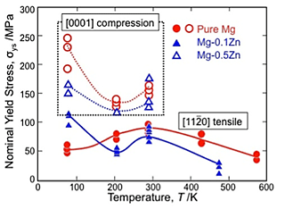 Figure 4 shows temperature dependence of yield stress in Mg-Zn. The yield stress of Mg-Zn alloys increased in the range form 203K to 293K, namely, the yield stress of second order pyramidal slip shows anomalous temperature dependence in the range from 203K to 293K. However, the yield stress decreased with increasing temperature above 293K. Yield stress also decreased by small amount of zinc addition in the temperature range from 203K to 473K. However, the yield stress of Mg-Zn at 77K is two times higher than that of pure magnesium. According to dislocation mechanism of second order pyramidal slip, decrease of yield stress by second order pyramidal slip would be explained by decreasing of immobilization of (c+a) edge dislocation by increase of basal slip by zinc addition.