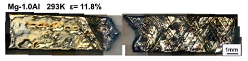 Figure 7 shows {1011} twin observed on Mg-1.0at%Al at 293K. Mg-1.0at%Al was yielded and deformed by {1011} twins.