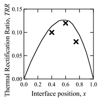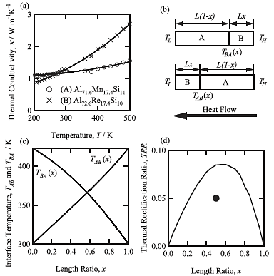 Finally, we show the x dependence of TRR calculated for the thermal rectifiers consisting of Al62Cu25.5Fe12.5 icosahedral quasicrystal and a semiconducting, single grained material, Si or Ge, both of which are characterized by a high Debye temperature. TRR was calculated for TL = 300 K and TH = 1000 K, and plotted as a function of length ratio x = LSi or Ge / LAl-Cu-Fe in Fig.7 (b). The large magnitude of TRR exceeding unity was obtained for the sets of real materials, and the maximum value of TRR was 1.34 and 1.24 for Si/Al62Cu25.5Fe12.5 and Ge/Al62Cu25.5Fe12.5, respectively.