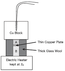 The heat current was estimated by measuring the temperature of a large copper block placed on the composite sample, the bottom of which was heated up using a plate-heater kept at 500K. The experimental setup is schematically drawn in Fig. 2. In order to estimate the heat current flowing through the sample, we assumed that the heat leak from the copper block Jout is simply proportional to the temperature difference between the copper block and the ambient air as Jout = A(T(t)-Tamb). In such a case, the temperature of the copper block increases with heating-time as T(t)=
