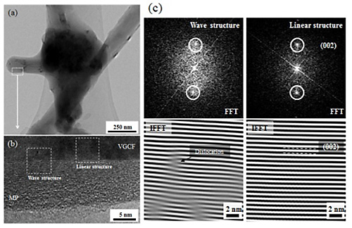 Fig. 4 (a) shows the crosslinked VGCFs by the bridging MP. Moreover, the VGCF surfaces were covered with a thin MP layer, which formed the bridging MP. Fig. 4 (b) shows the VGCF-MP interface, consisting of linear and wavy carbon structures, in the preform. Previous studies shows it is not only linear structure but also wavy carbon structures between the VGCFs. and MP. Fig. 4 (c) shows the results of the interfacial structures between the VGCFs and MP by FFT and IFFT. The wavy structure showed dislocation near the VGCF-MP interface. MP is believed to bridge the VGCFs by combining the free-carbon atoms in MP with the dangling bonds, which are empty valence orbitals on the surface of immobilized atoms, at the VGCF dislocation edges.
