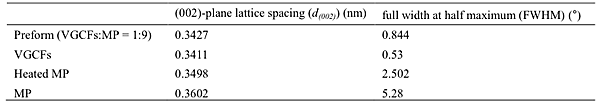 We used the VGCF-MP mixture to fabricate a preform in order to investigate how heating affected MP crystallization. The (002) peak in the XRD pattern for the heated VGCF-MP mixture was sharper than that in the pattern for the heated monolithic MP. Moreover, the (002)-plane lattice spacing for the VGCF-MP mixture was slightly narrower (0.3427 nm) than that for the heated MP (0.3498 nm). The preform exhibited the narrowest (002)-plane lattice spacing.