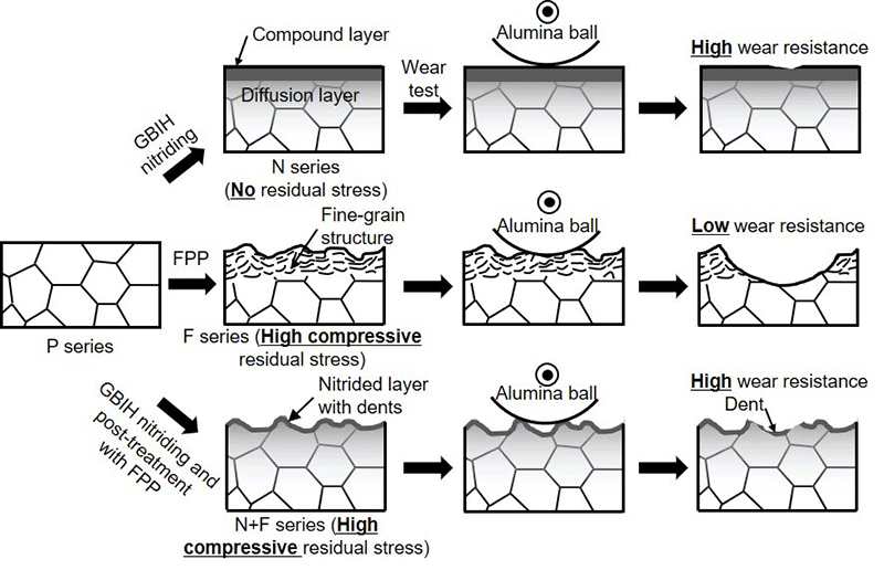 Schematic illustration of surface modified layers created and wear behavior of Gas Blow IH nitriding(N series), FPP treated(F series), and GBIH nitride with post-treatment with FPP(N+Fseris) specimens.