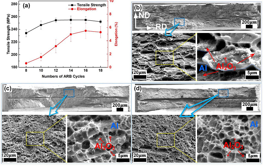 (a) is a variation of Al2O3/Al composite tensile strength and elongation with increasing ARB cycles, and SEM pictures showing the fractography of Al2O3/Al composites processed by (b) 8, (c) 14, and (d) 18 ARB cycles.