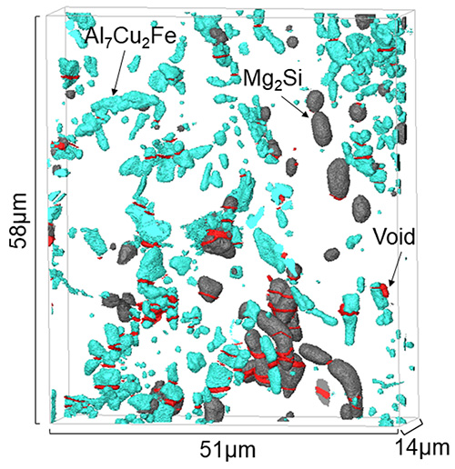 3D perspective view of Al7Cu2Fe particles, Mg2Si particles and voids captured at the εa of 4.2% in high-hydrogen Al-Zn-Mg-Cu alloy using synchrotron X-ray nano tomography.