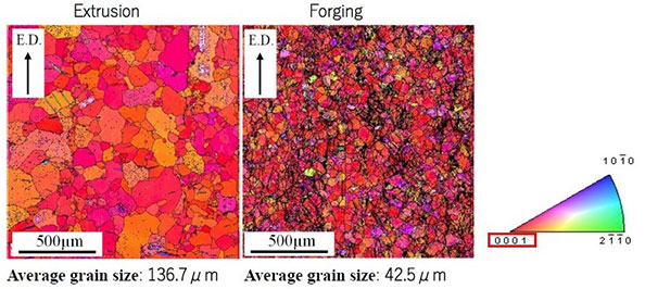 A inverse pole figure map and (0001) pole map are shown. Average crystal grain size of extruded material was 136.7 [µm], and the average crystal grain size of the forged material was 42.5 [µm].