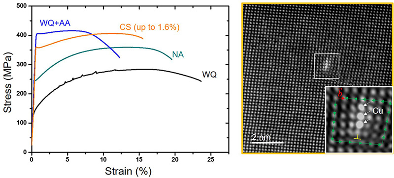 The CS sample has excellent mechanical properties. The direct evidence of Cu aggregation on an edge dislocation was observed.